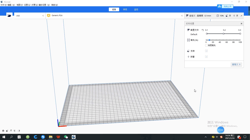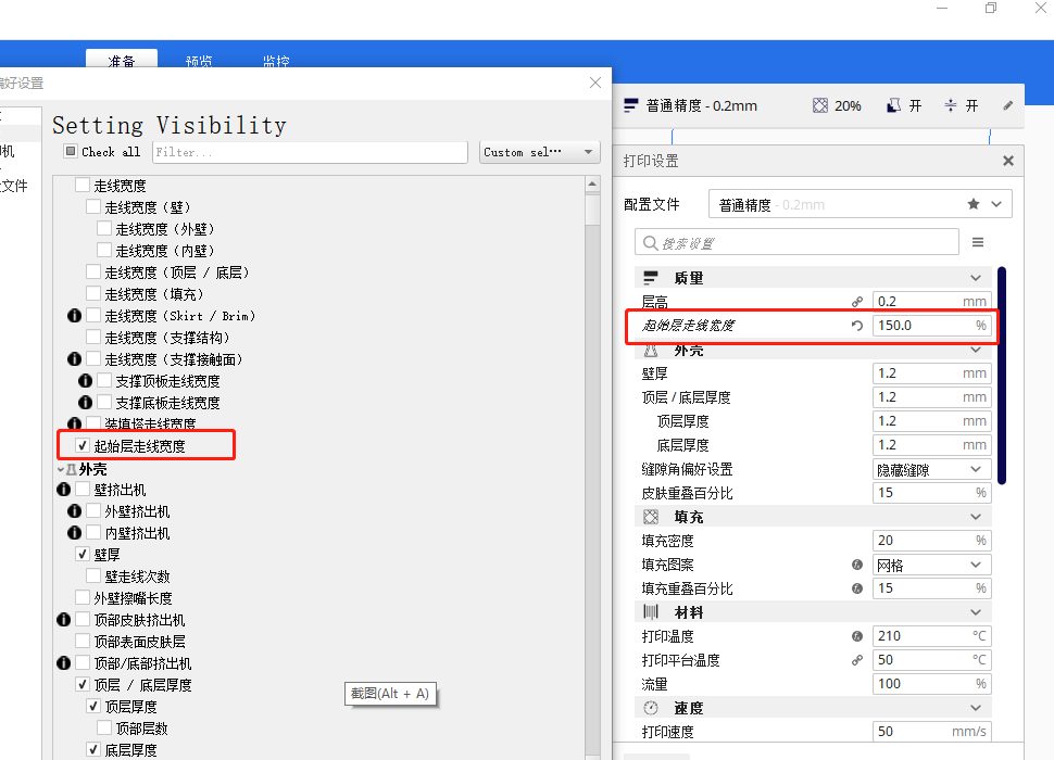 可對(duì)于起始層走線寬度進(jìn)行修改,最高為150%比例,可提高起始層與熱床粘附的效果。