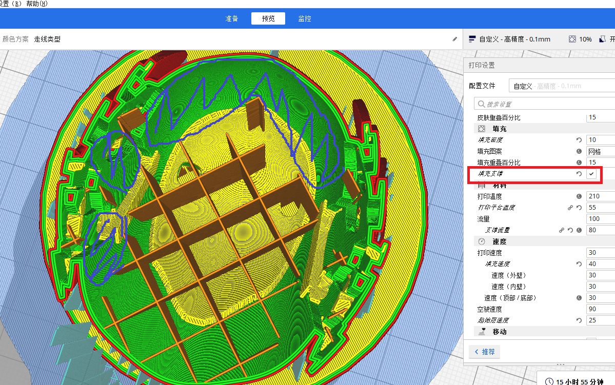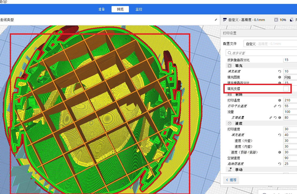 此功能可實(shí)現(xiàn)只在模型頂部需要支撐的區(qū)域產(chǎn)生填充,相比無(wú)填充,保證了模型頂部不會(huì)掉落,并較大幅度減少了打印時(shí)間和用料。