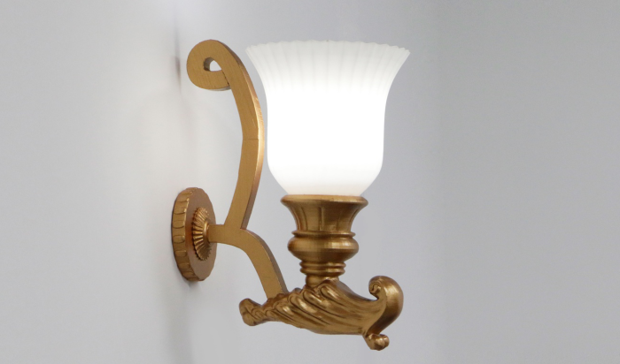 這款歐式壁燈燈壁厚度約1.5mm,采用了透明的PLA 3D打印材料一次性打印成品,燈罩處可以配置不同顏色的LED燈芯,在保證美觀的前提下,照明效果能達到足夠的亮度。