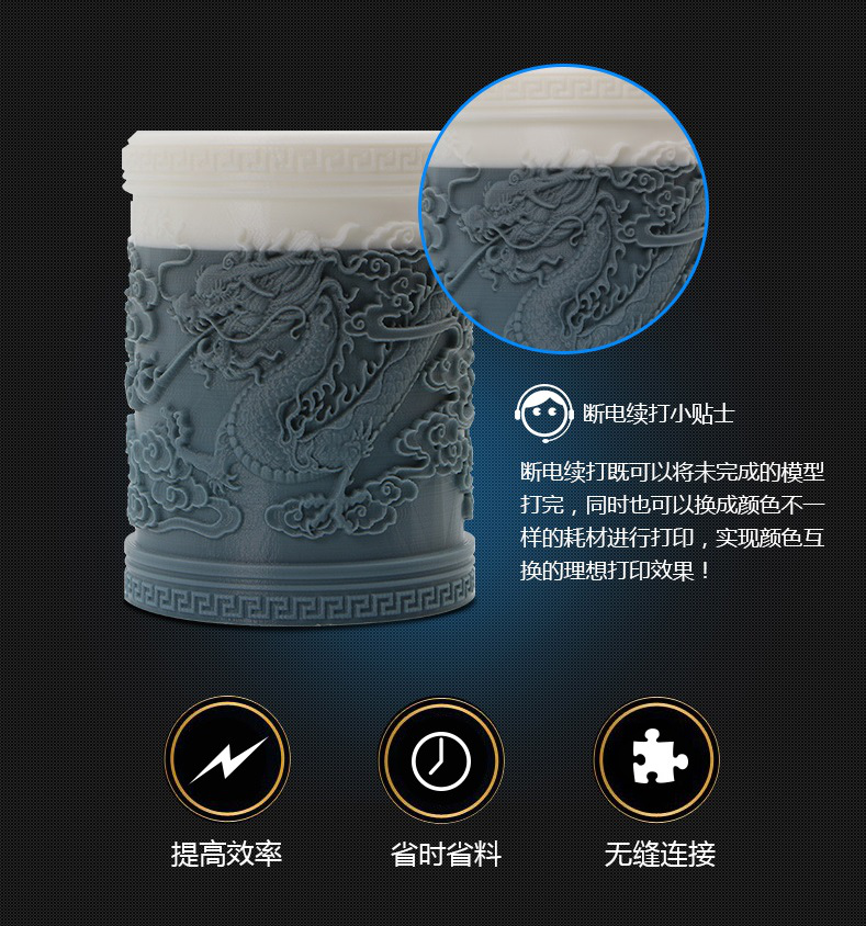 A8S使用了研發(fā)的專利噴頭,出絲更順暢,特殊的內(nèi)部構(gòu)型降低了堵頭風(fēng)險(xiǎn),提高了30%以上的使用壽命。CNC加工一體成型的打印平臺(tái),平整度更高,能夠有效提高噴頭的準(zhǔn)確定位。雙擠出機(jī)同步擠出,能夠保證擠出順暢,同時(shí)也降低了單擠出機(jī)容易出現(xiàn)的斷料風(fēng)險(xiǎn),對(duì)于中途更換材料也有極高的便利性。